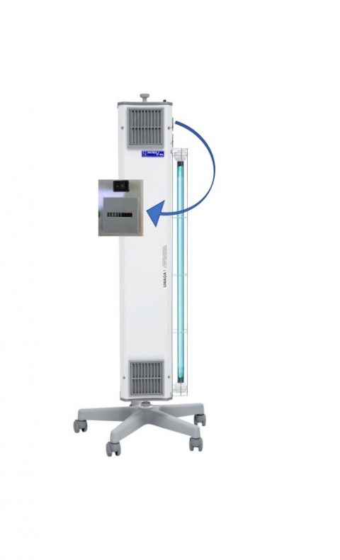 • I funkcja – przepływowa – oznacza, że dezynfekcji podlega powietrze . Funkcja ta jest w 100 % bezpieczna dla człowieka. Promienie UV-C które dezynfekują powietrze są zamknięte wewnątrz metalowej kopuły przez co nie wydostają się z urządzenia. Wewnętrzne promienniki UV-C dezaktywują wirusy, pleśnie, grzyby, bakterie i wszelkie inne drobnoustroje w chwili, gdy personel i pacjenci przebywają w pomieszczeniu. Biobójcze promieniowanie UV-C o długości fali 253 nm nie wydostaje się na zewnątrz, dzięki zastosowaniu obudowy z blachy kwasoodpornej.