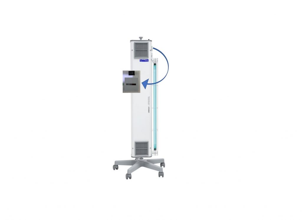 • I funkcja – przepływowa – oznacza, że dezynfekcji podlega powietrze . Funkcja ta jest w 100 % bezpieczna dla człowieka. Promienie UV-C które dezynfekują powietrze są zamknięte wewnątrz metalowej kopuły przez co nie wydostają się z urządzenia. Wewnętrzne promienniki UV-C dezaktywują wirusy, pleśnie, grzyby, bakterie i wszelkie inne drobnoustroje w chwili, gdy personel i pacjenci przebywają w pomieszczeniu. Biobójcze promieniowanie UV-C o długości fali 253 nm nie wydostaje się na zewnątrz, dzięki zastosowaniu obudowy z blachy kwasoodpornej.